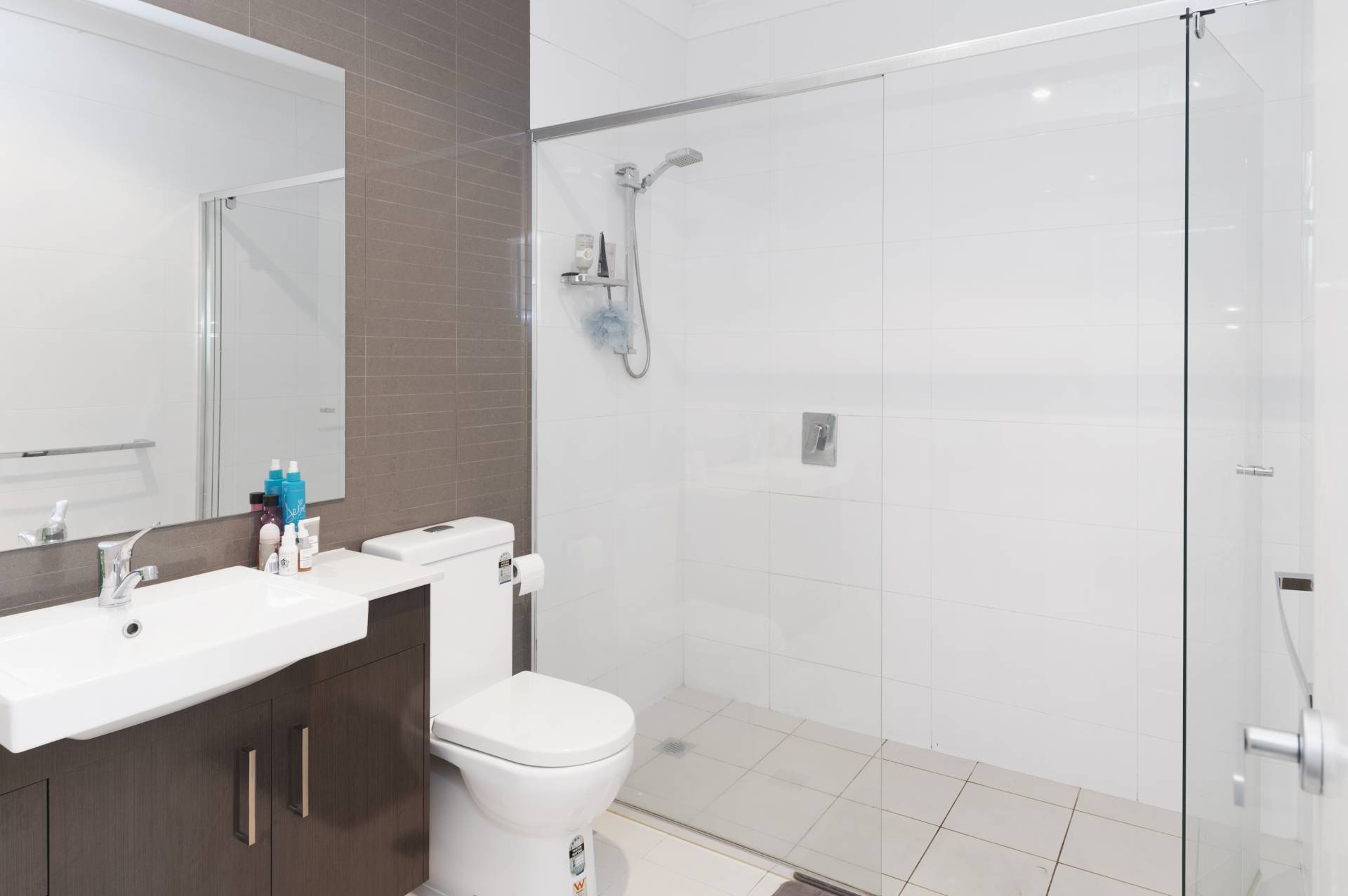 - Modern, central bathroom tiled ceiling to floor