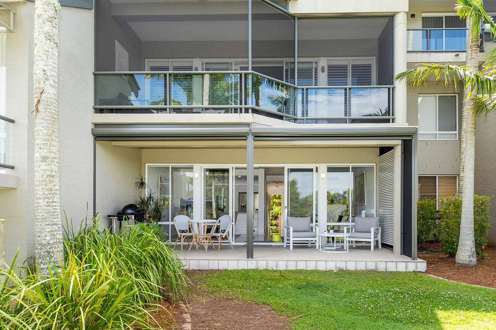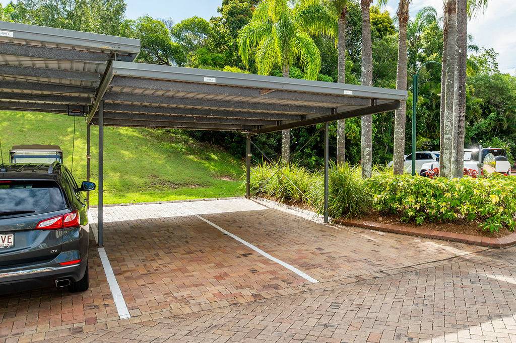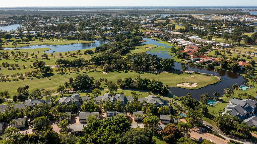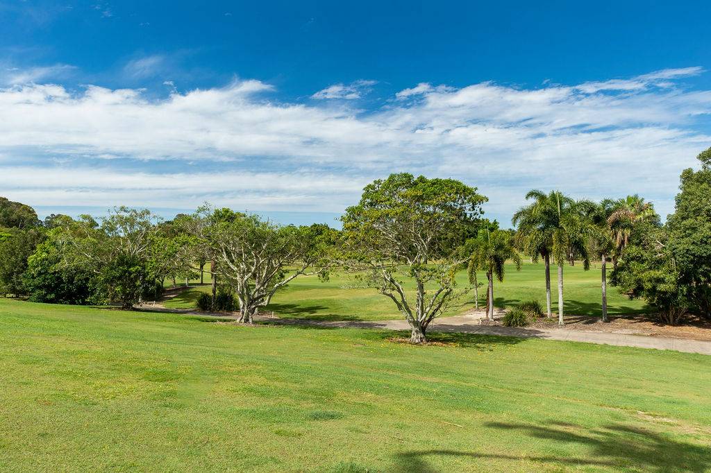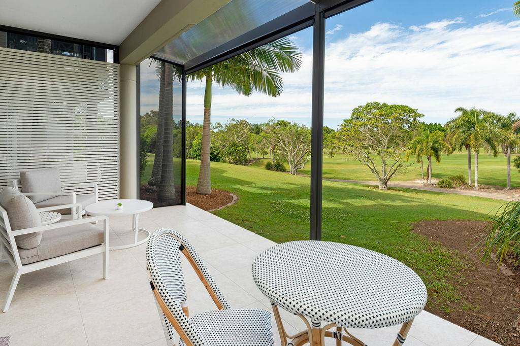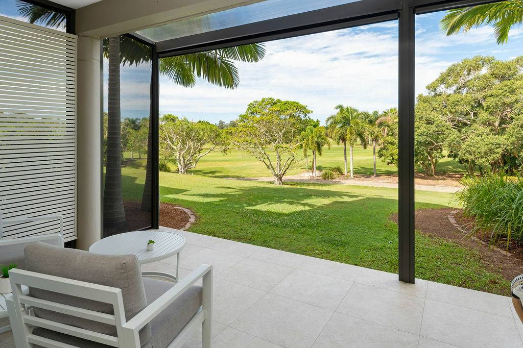 Adjacent to the kitchen is an additional space for a second sitting area or small office for those who prefer to work from home. The shared lounge and dining area boast an abundance of light with plenty of windows that provide additional ambience with sublime views of one of the fairways and its surrounding foliage. This space leads onto a charming outdoor undercover Florida room perfect for enjoying those tropical evenings, lazy Sundays and magnificent sunsets or sunrises. Adorned with remote controlled awnings and accessible by buggy, cosy enough for a one on one catch up, accommodating enough for a small gathering of loved ones. All of this certainly gives new meaning to “diamond in the rough” when such a treasure is right on the edge of a golf course.