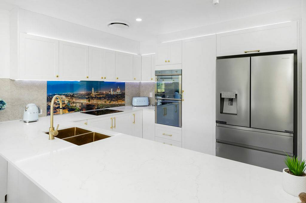 The kitchen is state of the art and a Kingsman design at that. Outfitted with some of the best culinary technology you can find in a home of this scale, it wouldn’t be at all hard to discover a love for cooking and experimenting. Included you’ll find: imported Italian stone bench tops, Smeg microwave/oven combo and stand-alone oven with self-cleaning function, high quality Smeg electric 4 burner stove, Fischer & Paykel stainless steel double drawer dishwasher, tiled surfaces and splash-back with gorgeous panoramic backdrop (insert can be changed), and 2 sinks for extra convenience