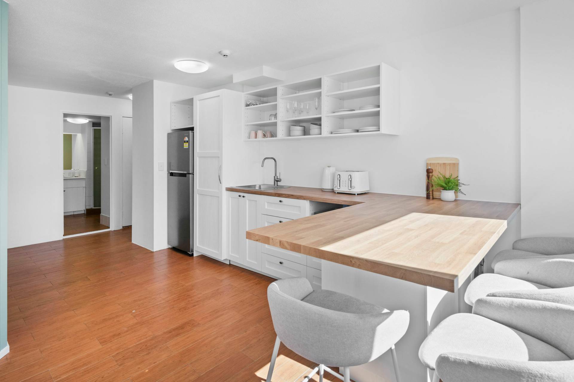 Located on the 5th floor and accessible by a recently refurbished foyer with FOB controlled security doors and new elevator, the apartment grants an added level of security as well as peace of mind. Fully renovated and fully furnished with brand new furniture, this gem has been made ready for either; immediate occupancy, a potential air b ‘n’ b or a permanent rental investment. Either way you cut it, it’s an enviable lifestyle.